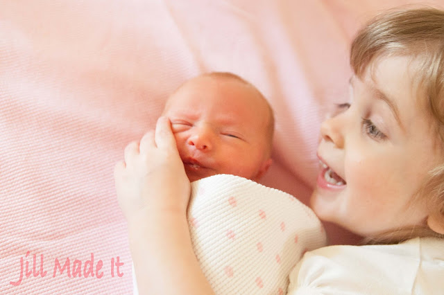 This precious little baby joined our family a month early, and she certainly is tiny. She was only 4 lb 10 oz at birth. (It was really funny--while she was waiting in the hospital nursery to be checked by the doctor, right next to her was a 10 lb newborn...just in case we didn't realize how very tiny she was.) If you remember from this post, she was small for how far along in the pregnancy we were, and we never did find out why. So we were worried about her, and when she came early, we expected some time in the NICU. But she's a healthy little squirt. No NICU, no breathing problems (very common for 36 week babies, as I understand it), no jaundice, even. (Well, it wasn't bad enough to need light therapy, anyways.)