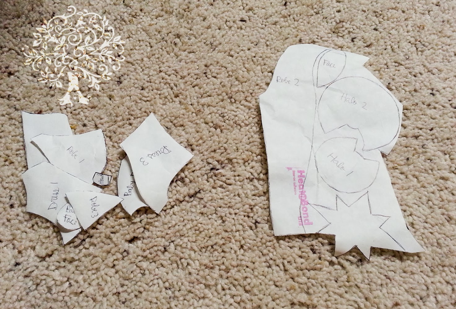 After printing or designing your pattern pieces place then fusible webbing or sew-able heat-n-bond above the pattern (paper side up) making sure you trace all the pattern pieces. After that it's just a matter of cutting out the adhesive pattern pieces and ironing them to your scraps of fabric, cutting them out of the scraps and removing the backing paper.